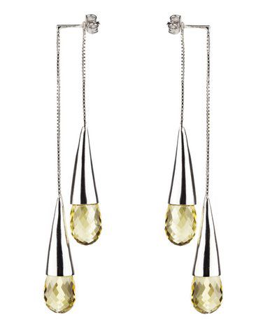 Brinco em prata com banho de rodio, dimensões 1 x 8 cm e 4 pedras gota briole de 9 x 19 mm. Acabamento polido.