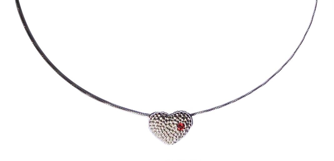 Colar em prata com banho de rodio, dimensões 1,5 x 2 cm e 1 pedra granada redonda de 3 mm. Acabemento polido. Corrente veneziana 50 cm.