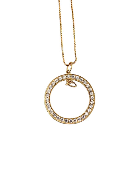Colar em prata com banho de ouro amarelo, 2 cm de diâmetro, 32 pedras zirconias de 1,5mm. Corrente Veneziana com 40/45 cm. Acabamento polido. Pingentes ilustrativos.