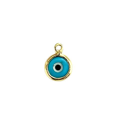 Pingente em prata com banho de ouro amarelo , dimensões diâmetro 0,75cm, 1 pedra olho grego de 5mm . Colar ilustrativo . Acabamento polido.